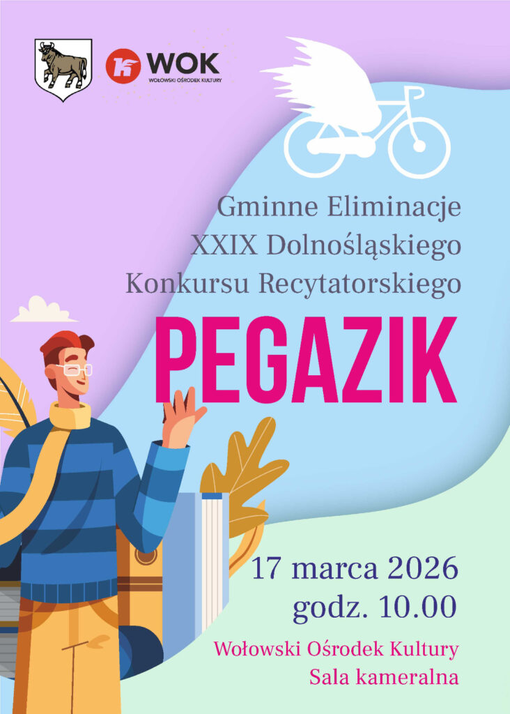 Wołowski Ośrodek Kultury serdecznie zaprasza uczniów gminnych szkół do udziału w XXIX Dolnośląskim Konkursie Recytatorskim „PEGAZIK” organizowanym przez Kłodzkie Centrum Kultury, Sportu i Rekreacji.
